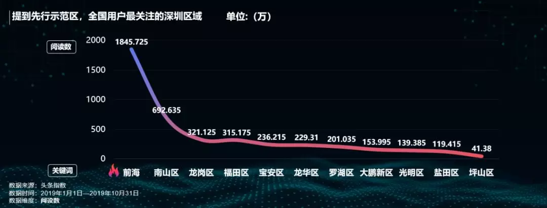 提到先行示范区,全国网友最关注的深圳区域是前海和南山区。作为特区中的特区,前海将奋力成为先行示范区核心引擎区域,关注度遥遥领先。而被誉为“中国硅谷”的南山,在科技大热的今年,关注度仅次于前海。