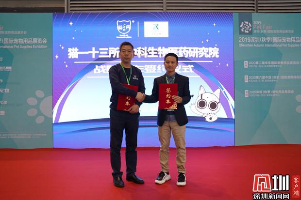 见圳客户端·深圳新闻网2019年12月27日讯(见圳客户端、深圳新闻网记者 金洪竹)12月27日,中科生物医药研究院与猫一十三所战略合作签约仪式在深圳会展中心举行,双方正式达成战略合作并表示未来将在宠物领域,特别是宠物猫领域投入研发力量,为宠物主人和宠物提供优质全面的生物科技服务。