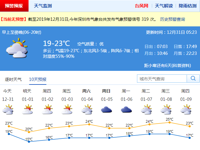 见圳客户端·深圳新闻网2019年12月31日讯 即将到来的元旦小长假,12月31日至1月1日受冷空气影响,阴天转多云,沿海、高地和海区阵风6-7级,能见度转好,气温下降3-4℃;元旦(1月1日)多云,可见阳光,早晨最低气温14℃左右,最高气温20℃;2日起冷空气减弱,气温逐渐回升。