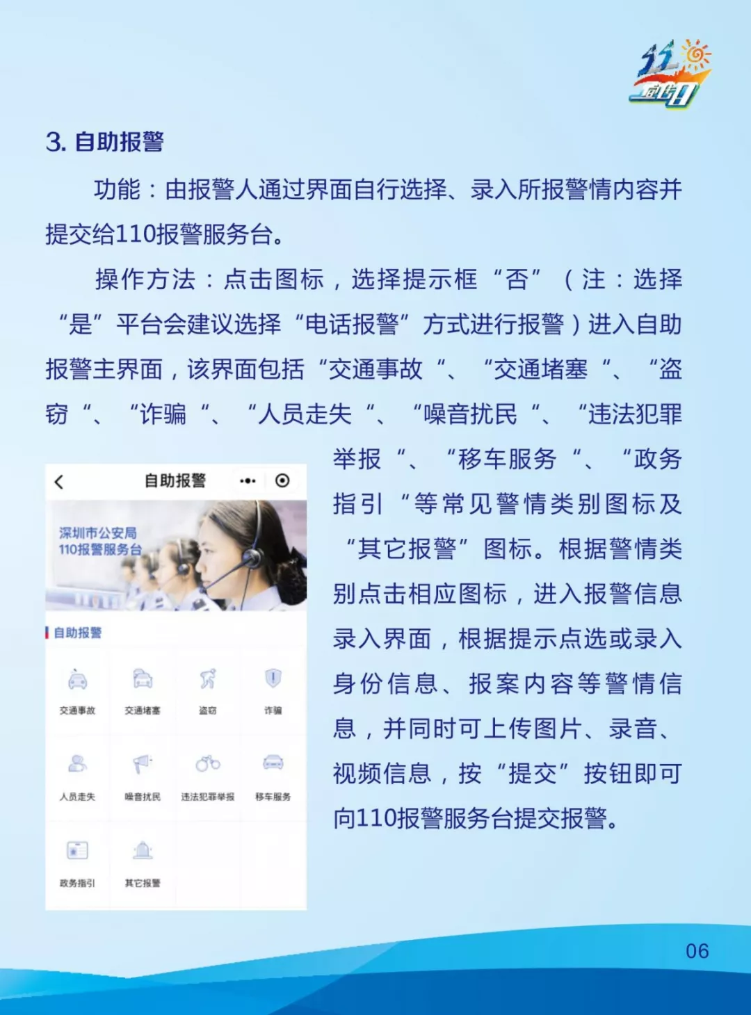 “广东110”除了报警功能,还将上线新功能!“110宣传日”当天,“广东110”报警小程序的交通事故快处快赔功能上线。还可了解到深圳交警星级用户轻微事故远程处理系统相关资讯,现场教您轻松掌握交通事故快处快赔办法。