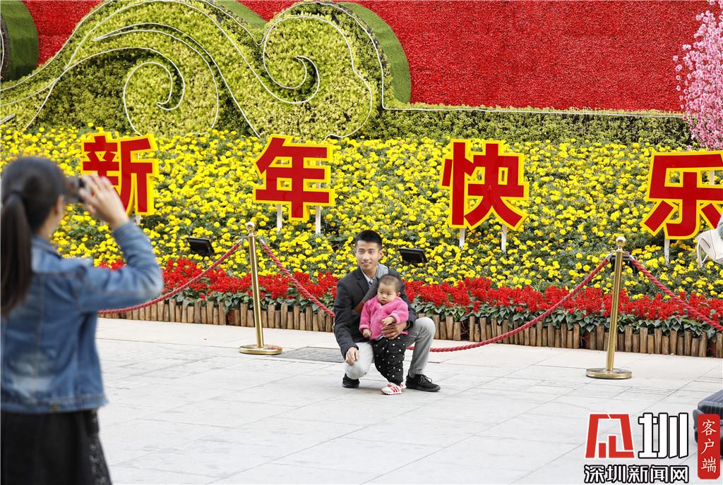 深圳北站东广场,一位家长和孩子在“新年快乐”的牌子前合影留念。