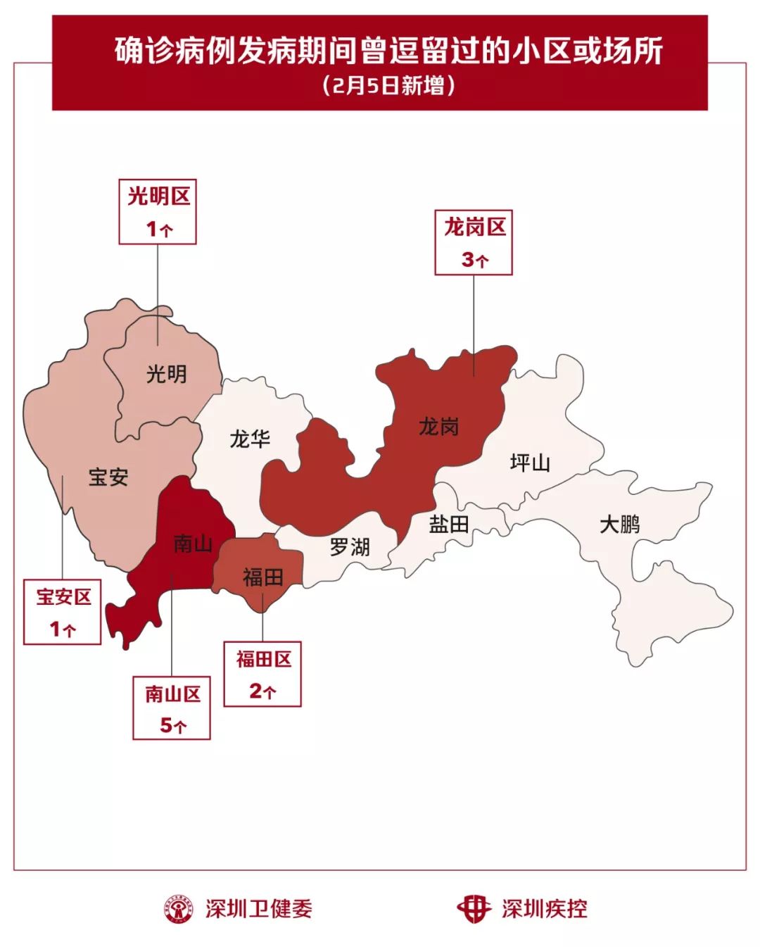 2月5日,疾控专业人员通过最新的流行病学调查确认,深圳新增12个小区(场所),有新确诊的病人在出现病征期间曾经逗留。