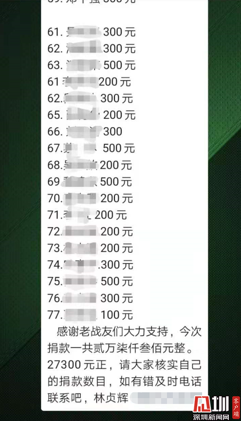 “各位战友,现在疫情形势如此严峻,正是需要我们排忧解难的时候,我们不能袖手旁观,现向战友们发起防护口罩捐助倡议……”早在2月2日,林贞辉便在翠竹街道退役军人微信群里发起捐款倡议。捐款的倡议一发出,便得到热烈响应,退役军人们纷纷在群里接龙捐款:200元、300元、500元……微信群里的捐款数字不断累加,不到一天的时间,便筹集到来自76位退役军人的爱心善款27300元。