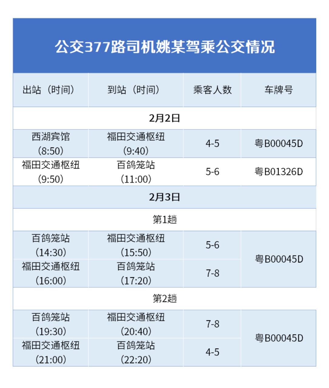 根据姚某的行车记录,2月2日早上8时50分,他随377路跟班一趟,从西湖宾馆站至福田交通枢纽,又从该站换车至百鸽笼站,每一辆公交车的乘客人数为4-6人。跟班时,姚某多数时间坐在公交车中后部,并佩戴口罩。