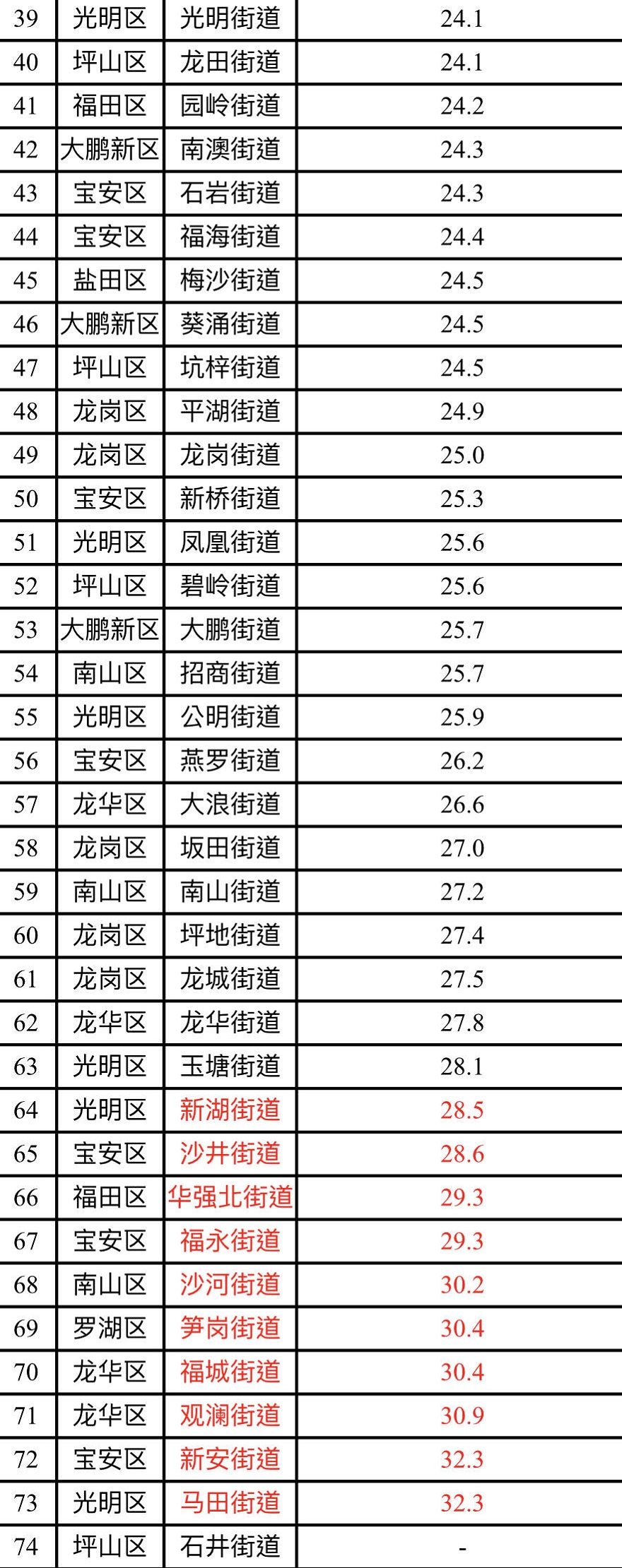 见圳客户端·深圳新闻网2020年2月12日讯(见圳客户端、深圳新闻网记者 陈婕)2020年1月,深圳市74个街道PM2.5浓度在18.4-32.3微克/立方米之间,均值为24.3微克/立方米。排名前十的是:横岗、黄贝、盐田、海山、桃源、梅林、南湖、福田、东门和翠竹等街道,排名倒数前十的是:马田、新安、观澜、福城、笋岗、沙河、福永、华强北、沙井和新湖等街道。