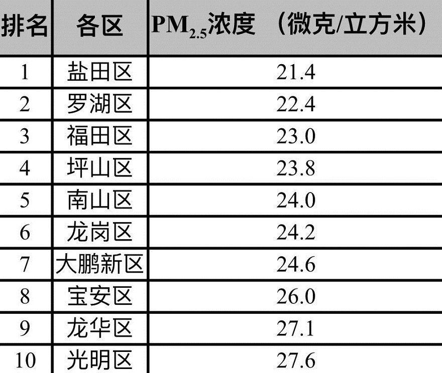 此外,各区PM2.5平均浓度在21.4-27.6微克/立方米之间,浓度较低的有盐田、罗湖和福田,浓度较高的有光明、龙华和宝安。