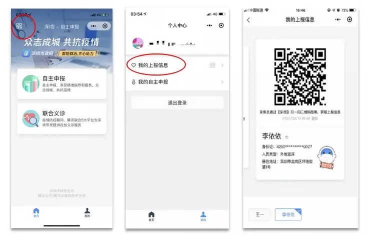在进出小区时,可在“深i您-自主申报”小程序首页点击左上角“二维码图标”或前往“我的>个人中心”点击“我的上报信息”向工作人员出示“深i您-自主申报”平台生成的系统认证图码,凭该图码出入小区,无需作重复申报。