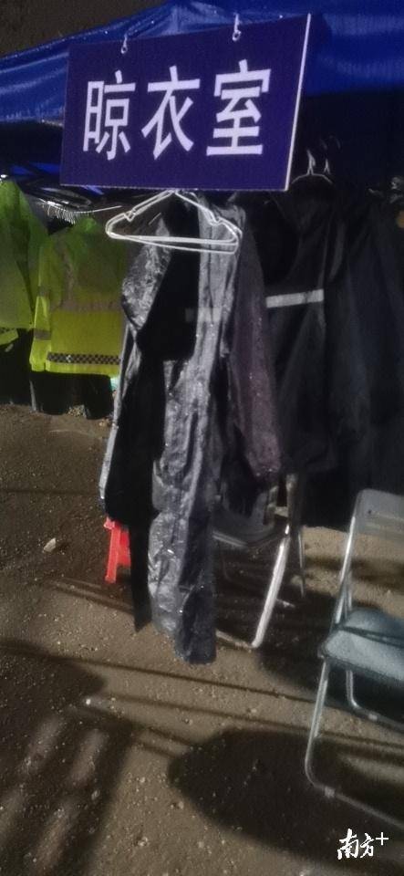 大雨滂沱,工作人员鞋子几乎湿透。