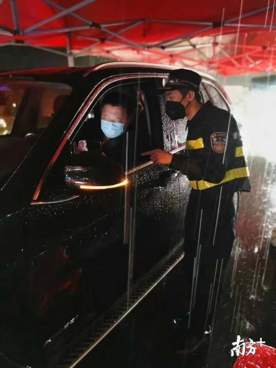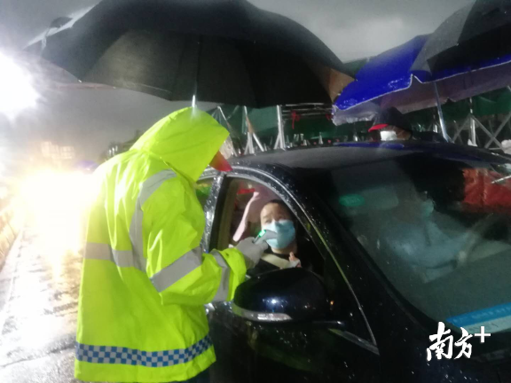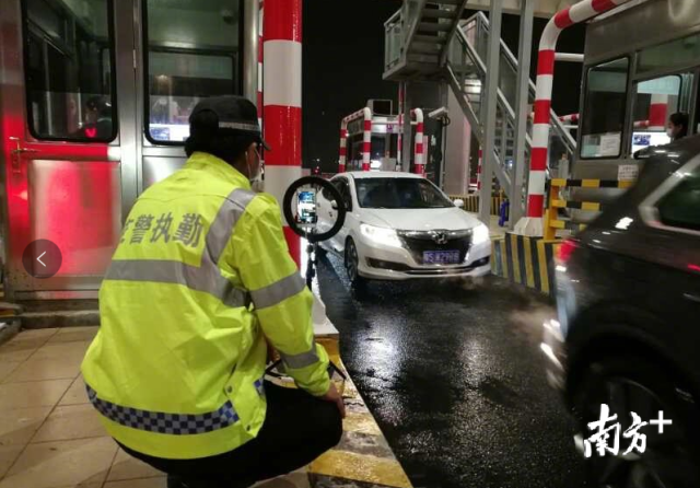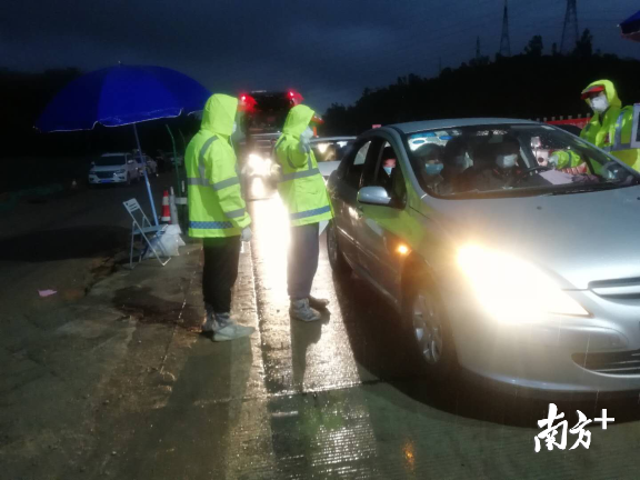 龙城街道党员干部、工作人员与龙岗区退役军人义工队、龙岗交警组成防控队伍,借助现场高速雨棚的遮挡,对进深车辆一一进行排查。