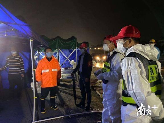 坪地街道党工委书记曾宪旺冒雨夜巡检查点,了解当日车流量以及重点区域人员返深情况,同时慰问一线执勤人员及志愿者。