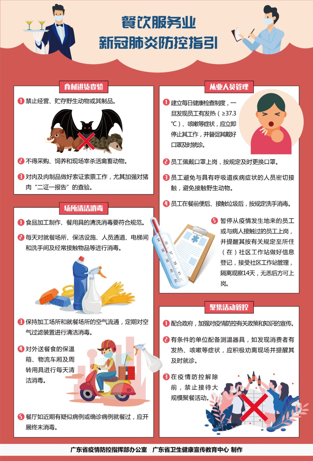 1、严格按照《机关、企业及工厂节后复工防控新型冠状病毒肺炎工作指引》(粤卫疾控函〔2020〕14号)、《餐饮服务食品安全操作规范》要求以及国家卫生健康委员会《新型冠状病毒感染的肺炎防控方案》《新型冠状病毒感染的肺炎公众防护指南》等防控要求,建立健全防控制度,压实防控责任,严格从业人员管理,杜绝从业人员带病上岗。