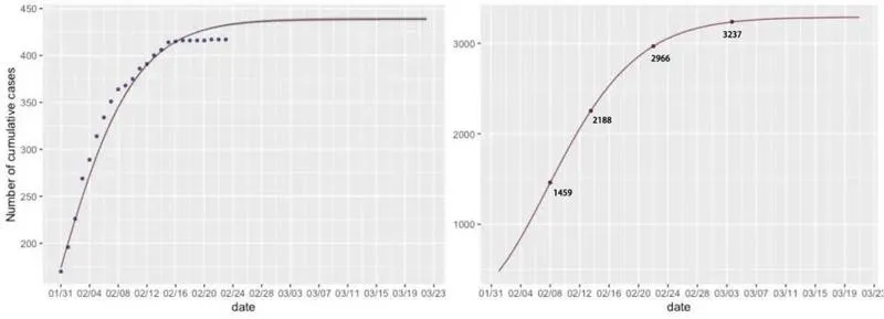进一步地拟合深圳新冠肺炎的累计确诊人数,并对累计确诊人数做出预测。可以看到,模型预测自2月28日起病例数不再增加,预测得到最终的累计确诊人数收敛在422人左右。