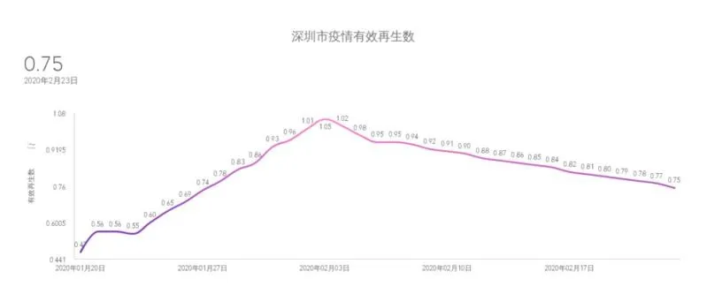最后,考虑新冠肺炎的有效再生数。有效再生数,即有效感染数,指一个患病者平均可以感染健康者的人数。当有效再生数下降到1以内时,可以认为疫情就已经得到了很好的控制并将逐渐消失。以全国第一例确诊患者的报道时间为疫情开始时间,计算出深圳市疫情有效再生数,可以看到有效再生数在经过一段时间上升后,在2月3日附近出现拐点,2月3日之后处于逐渐下降水平,2月23日已从峰值的1.05下降到了0.75,说明针对疫情的一系列防控措施取得了很好的效果。