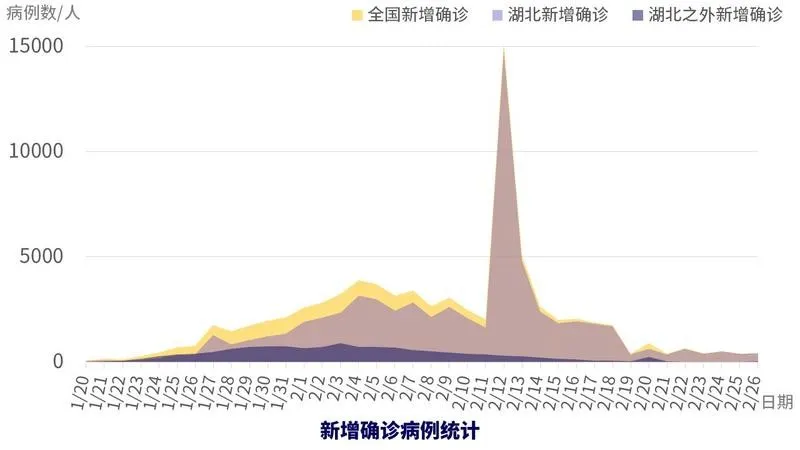 目前每日新增确诊病例呈下降趋势。2月3日,非湖北地区新增确诊病例达到最高峰890例,之后逐渐下降(2月20日监狱系统新增确诊病例,造成数据波动),2月26日新增确诊病例降至24例,为最高峰的2.7%,前一天新增病例5例,仅为最高峰的0.56%。湖北地区新增确诊病例在2月4日达到最高峰3156例(2月12日,2月13日,由于确诊标准的改变,造成数据波动),随后基本呈下降趋势,2月26日新增确诊409例,为最高峰的12.96%。
