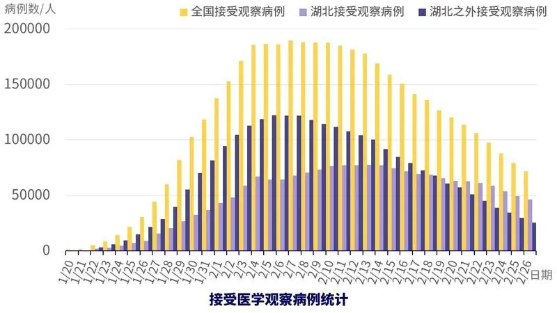 还值得关注的是正在接受医学观察的人数,在全国严格管控的情况下,未来新增确诊病例很大比例会来自这部分人群。从数据中可以看到,非湖北地区接受医学观察人数正在快速下降,湖北地区的也在稳步下降中,这可能预示着未来新增确诊病例也将下降。