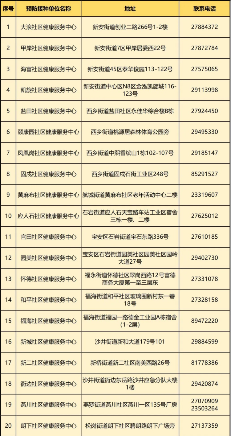 △宝安区提供预防接种服务的20家社区健康服务中心名单。