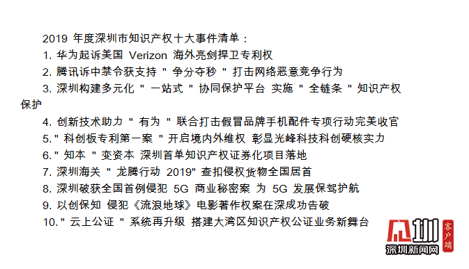 值得关注的是,在深圳市知识产权工作会议期间,全市2019年度知识产权十大事件正式对外发布,华为起诉美国Verizon、腾讯诉中禁令获支持、“有为”联合打击假冒品牌手机配件专项行动完美收官等事件上榜。