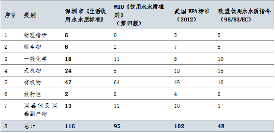表1、深圳市生活饮用水水质标准与其他的标准的比较