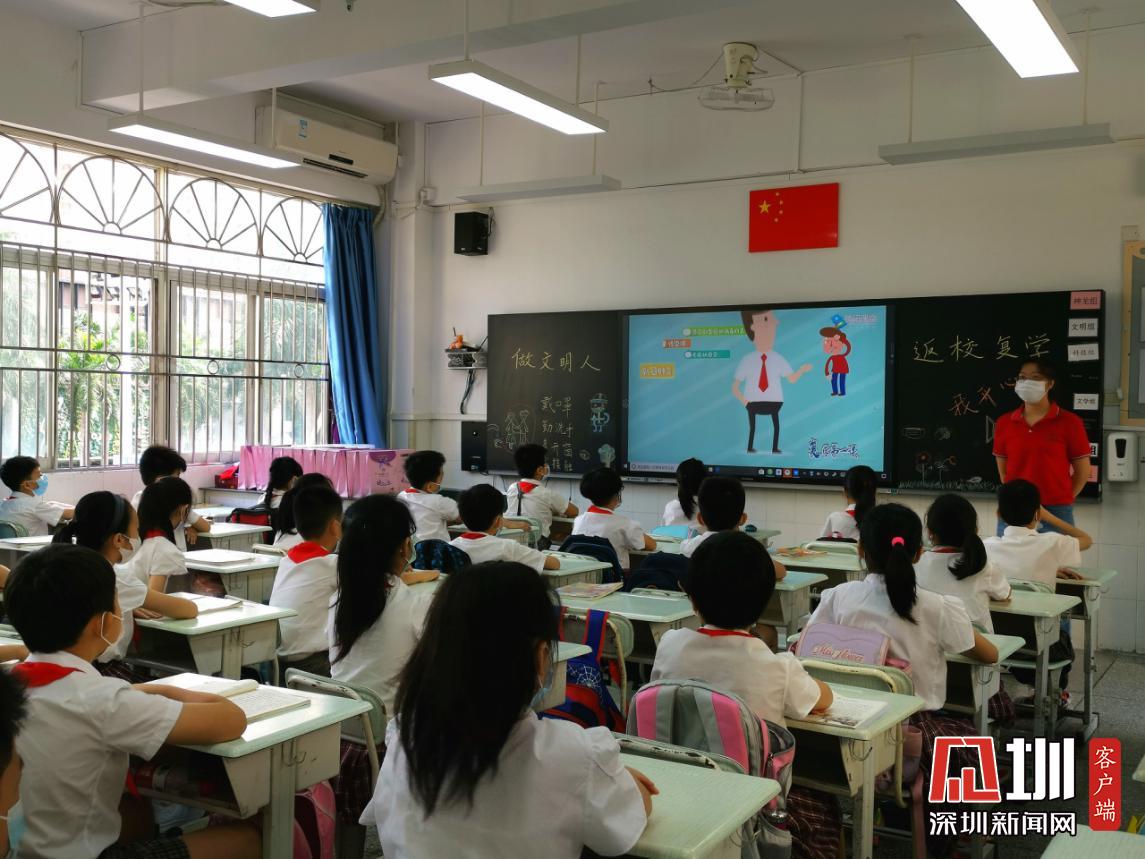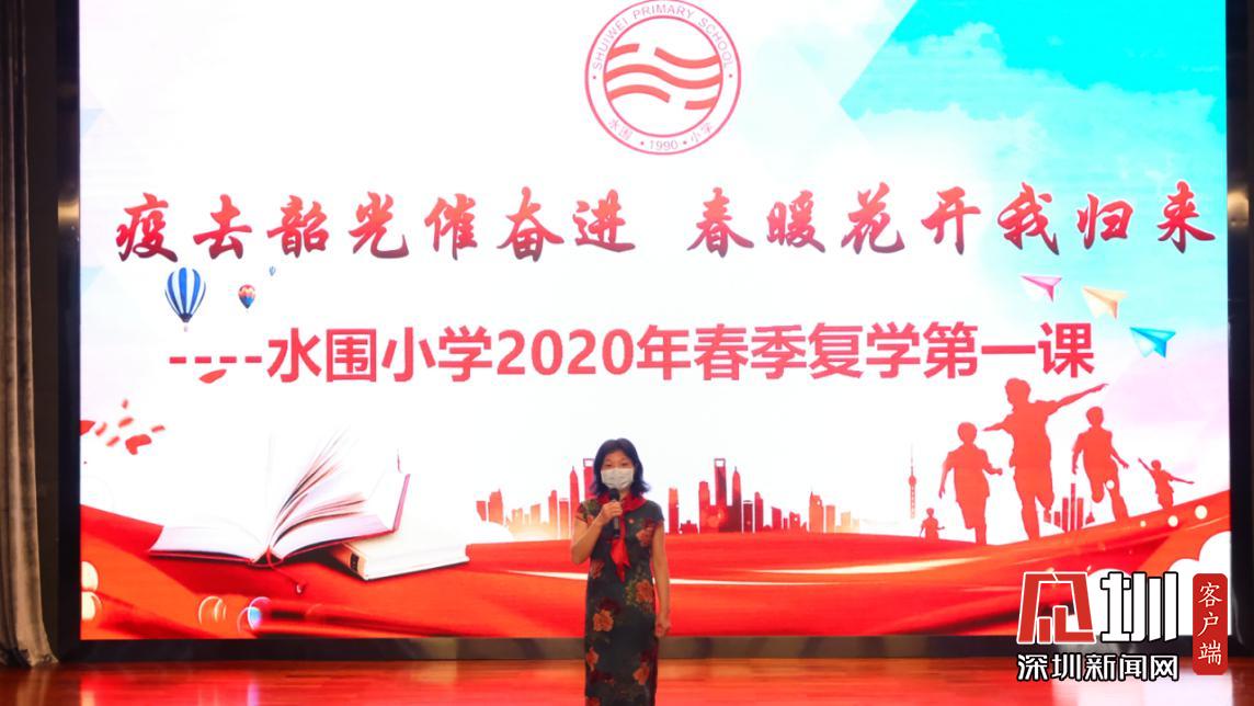 据悉,水围小学“复学典礼”上午8:40正式开始,出席的嘉宾有福田区教科院教研员、少先队总辅导员李楠、卫生健康副校长明昭。各班级的学生则带着口罩,单人单桌在教室内,以观看直播的方式参加典礼。