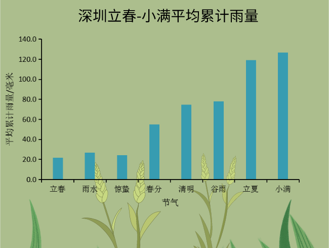 小满节气,除了气温不断地攀升,雨水也逐渐增多。伴随着南海夏季风的爆发,所谓小满大满,江河水满,意思是小满节气强降水过程频繁,间隔时间短,经常一波接一波。进入小满节气后,深圳也进入了一年一度的“龙舟水”时期。此时南方的暖湿气流活跃,与北方南下的冷空气交汇,往往会出现持续大范围的强降水。气象统计数据显示,小满节气后15天深圳平均累计雨量为126.9毫米,比之前的立夏时节降水更加丰沛。