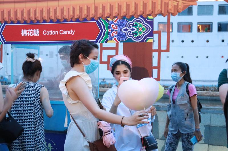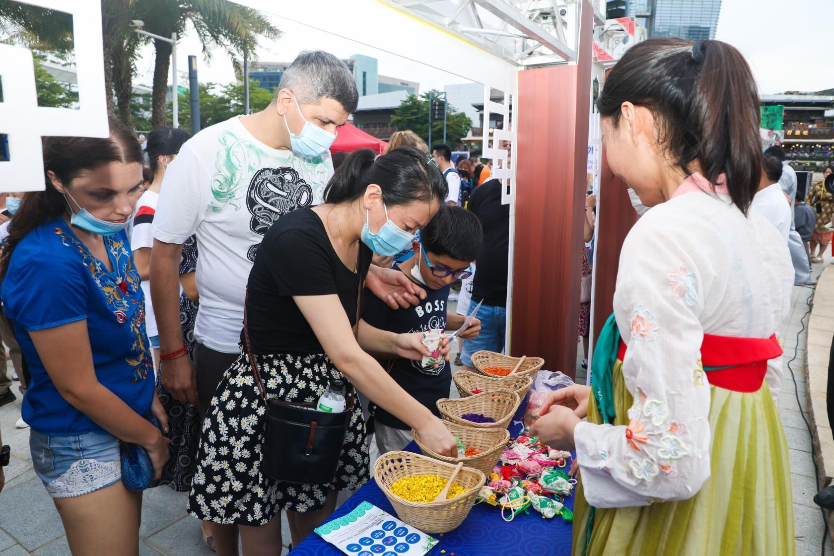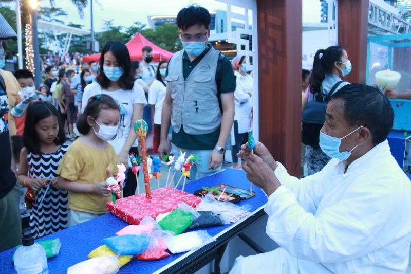 糖画、捏面人、穿汉服……当晚的海上世界广场热闹祥和,约300人次中外居民欢聚一起,互致美好祝福,在感受中国传统文化当中共度端午佳节。