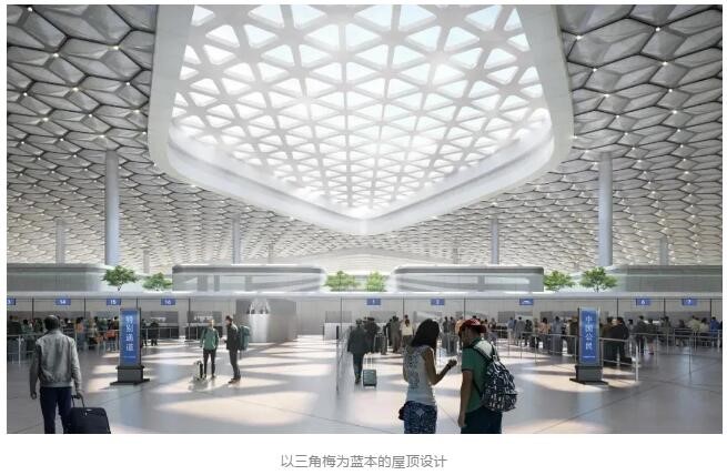 地面公园、主入口广场以及绿化屋顶以开放、友好的姿态展现生态环保表达建筑的公共属性。主入口处外立面向上,展露出内部的玻璃幕墙,以开放的姿态迎接旅客的到来。引入“垂直叠放”设计策略,高效组织口岸出入境及公共交通换乘,整合联系城市绿轴与福田口岸无缝连接,致力在区域核心打造一个开放、绿色与城市紧密联系的公共空间。