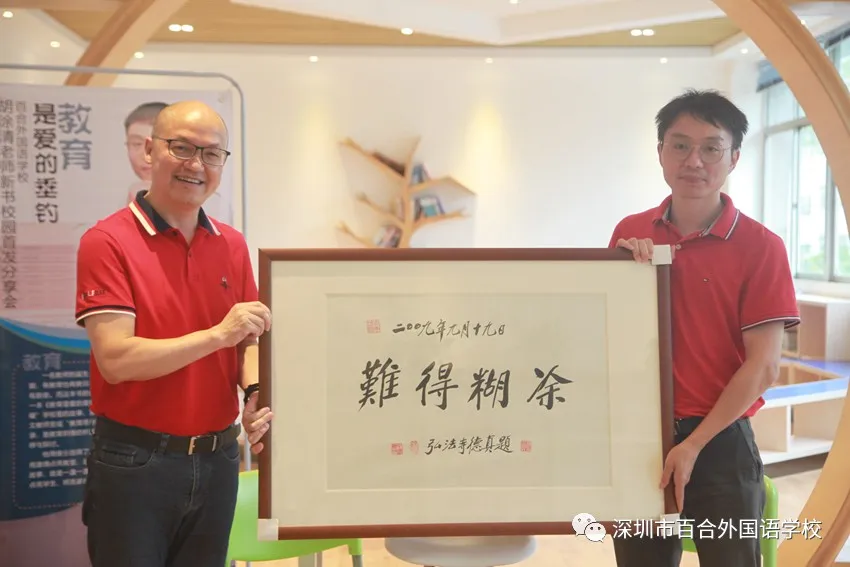 最后,朱正兴校长给胡涂清老师赠送了一幅书法匾额作为“贺礼”,上面写着“难得糊涂”。同时,朱校长也分享了自己的阅读心得:“特别感谢胡老师,这是百外自成立以来第一位把自己的教育心路历程以文字的形式集中展示给大家的老师,胡老师是我们的骄傲,也是我们学习的榜样,是百外教育工作者的写照缩影!胡老师对教育的坚守,对梦想的执著追求,在重复轮回的工作中,做着统一却又与众不同的事,做成了教育诗歌,做成了教育散文。胡老师安静却不安分,清醒中保持一份糊涂,几分激情,更有满怀的豁达……”