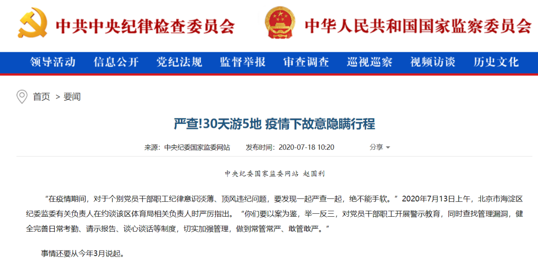 2020年7月13日上午,北京市海淀区纪委监委有关负责人在约谈该区体育局相关负责人时严厉指出。“你们要以案为鉴,举一反三,对党员干部职工开展警示教育,同时查找管理漏洞,健全完善日常考勤、请示报告、谈心谈话等制度,切实加强管理,做到常管常严、敢管敢严。”