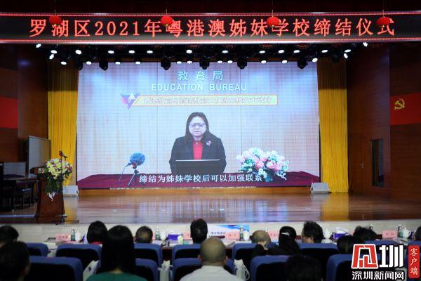见圳客户端·深圳新闻网3月31日讯(记者 刘晨 通讯员 韦林辛)3月30日下午,2021年罗湖区粤港澳姊妹学校结缔仪式在锦田小学二楼报告厅举行,仪式由深圳市罗湖区教育局主办,深圳市锦田小学承办。罗湖区25所学校、澳门3所学校在现场与香港27所学校通过网络连线举行签约仪式,深圳市螺岭外国语实验学校与香港保良局黄永树小学、澳门凼仔中葡学校,深圳市锦田小学与香港九龙塘天主教华德学校、澳门濠江中学等共55所粤港澳学校签约缔结为姊妹学校。深圳市螺岭外国语实验学校校长薛端斌,香港教联会副主席、打鼓岭岭英公立学校校长朱国强,澳门中华总商会附设青洲小学校长张捷分别作为粤港澳三地学校代表作了发言。