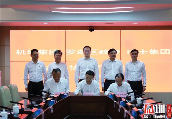 见圳客户端·深圳新闻网5月26日讯(记者 刘嘉敏)5月25日上午,罗湖区人民政府与深圳市机场(集团)有限公司、深圳巴士集团股份有限公司举行清水河城市候机楼合作框架协议签约仪式。在罗湖区委书记罗育德、深圳市机场(集团)有限公司董事长陈金祖、深圳巴士集团有限公司董事长戴斌、广深中青班挂职干部等共同见证下,罗湖区委常委、常务副区长范德繁、机场集团副总经理林小龙、巴士集团党委委员高波代表三方进行签约。