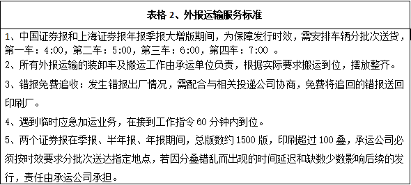 深圳报业集团印务有限公司现承印外报主要有上海证券报、中国证券报、羊城晚报等重要报刊,根据各报刊的具体要求,安全、准时、保质、保量地运送每天生产发行数量的各报刊到指定地点或客户手中,具体运输发行内容和标准详见下面表格。