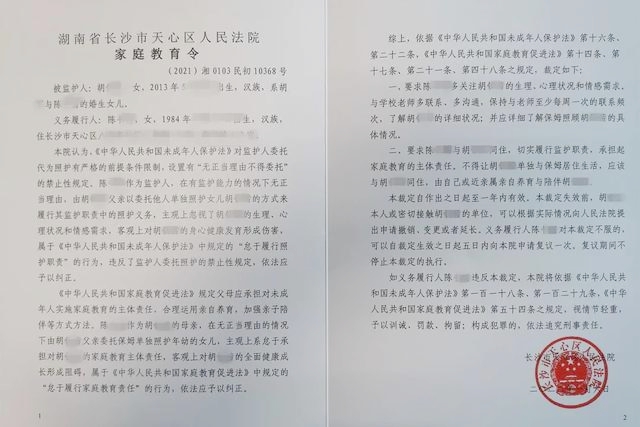 全国首份家庭教育令由长沙市天心区人民法院发出。