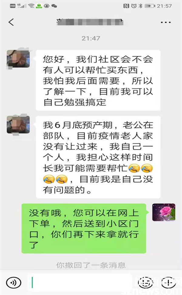 3月13日晚近十点,家住莲塘街道莲馨家园的黄女士通过微信向畔山社区党委副书记邹红梅求助,询问社区能否在自己待产不方便的情况下帮助购物送货……。原来,黄女士预产期在6月份,丈夫在部队服役,因为疫情原因,家中老人无法过来深圳照顾,只能自己在家休养,心理压力较大顾虑较多。了解到情况后,邹红梅耐心疏导黄女士焦虑和恐慌情绪,说明社区的关爱措施,并微信回复说,“需要帮忙,可以找我们。放心吧,有我们在。”