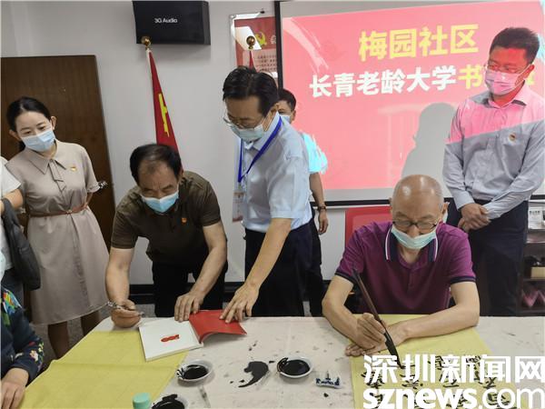 现场,还邀请了梅园社区长青老龄大学书法班邹洪涛老师向大家讲解,邹洪涛既是书法班的老师,也是社区第十党支部的支部书记,更是一名基建工程老兵。当邹洪涛介绍家喻户晓的照片《升》的主人公正是他本人,更是让王云虎对他竖起了大拇指。他激动地表示,邹洪涛的红岭大厦建筑工地上被定格的这张“顶天立地”的照片,是基建工程兵倾力投身改革开放的缩影,展示了深圳经济特区初创时蒸蒸日上的发展势头,是深圳建设初期时代张力的见证。