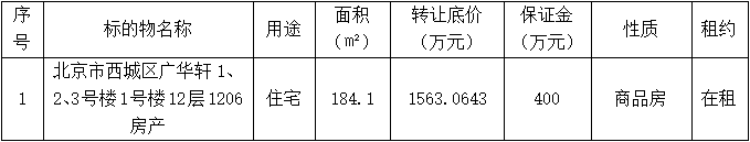 本次转让标的资产目前带有租约(租赁期限:2019年10月15日至2023年10月15日),转让方按转让合同约定办理房产移交手续,转让方不负责清退租赁合同到期、终止或解除后仍占有场地的租户,由受让方自行清场。意向受让方应在获得最终确认之日起15个工作日内与转让方签署实物资产交易合同。具体内容见北京产权交易所官网,欢迎有购房指标的竞买人参与竞买。
