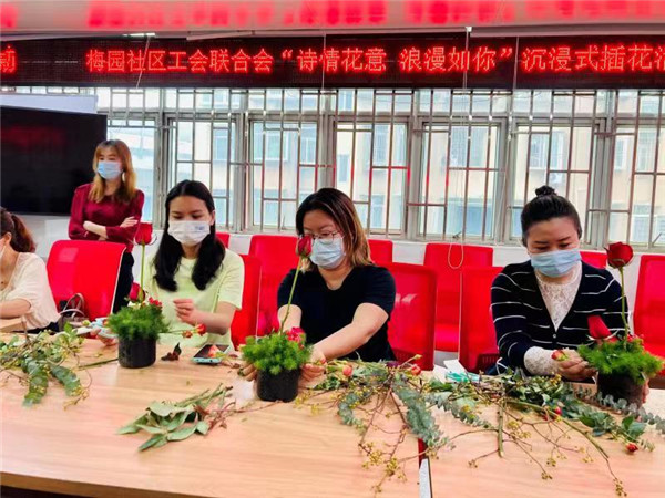 10月19日、21日,深圳市罗湖区清水河街道梅园社区工会联合会、梅园社区妇联、深圳市东西方社工服务社驻梅园社区党群服务中心的社工联合开展了两场“诗情花意 浪漫如你”沉浸式插花活动。