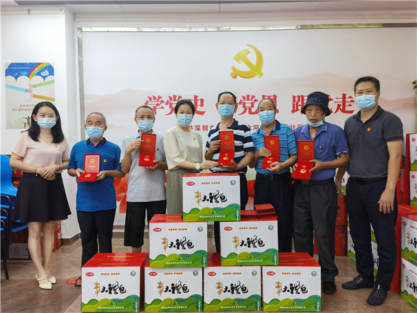 6月30日下午,深圳市罗湖区清水河街道梅园社区党委在党群服务中心二楼会议室举行庆祝建党百年颁发“光荣在党50年”纪念章暨“七一”慰问主题党日活动。