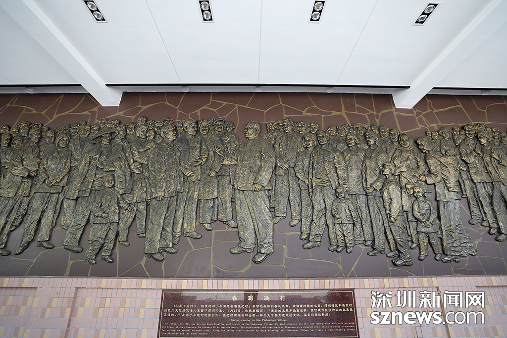 文化长廊中《春到渔村》的铜铸浮雕再现了1984年邓小平来渔民村考察的场景