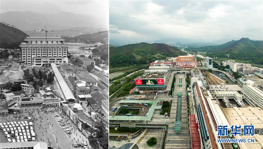 拼版照片:左图为当年深圳新建的联检大楼(资料照片,新华社记者卢炳辉摄);右图为2018年6月12日无人机拍摄的罗湖口岸联检大楼片区(新华社记者毛思倩摄)。