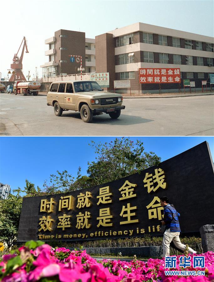 拼版照片:上图为深圳蛇口工业区办公大厦(资料照片,新华社记者徐佑珠摄);下图为2015年2月24日,一名男子走过深圳蛇口时间广场的“时间就是金钱,效率就是生命”牌(新华社记者毛思倩摄)。新华社发