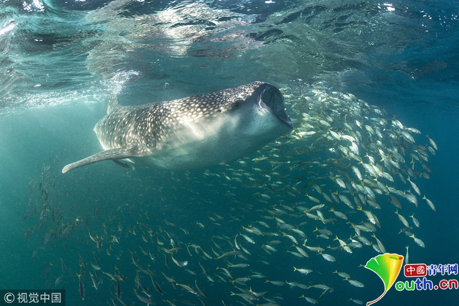 2018年3月30日讯(具体拍摄时间不详),非洲,一只鲸鲨张开大嘴试图吞下似龙卷风盘旋着的浮游生物群。