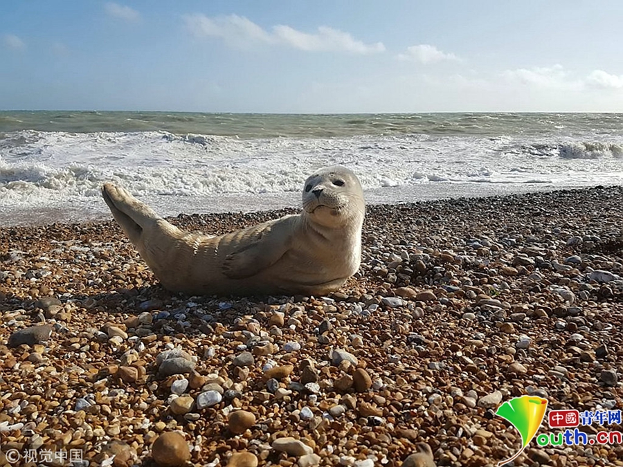 英国肯特郡邓杰内斯,46岁的达伦·伍德带着邻居家的孩子们钓鱼,这只可爱的海豹爬出海面跟他们“打招呼”。