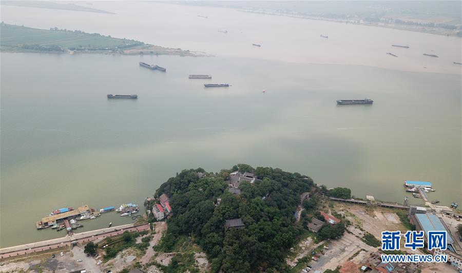 长江和鄱阳湖在江西省九江市湖口县石钟山附近交汇,形成江湖两色美景(8月5日无人机拍摄)。 新华社记者 金立旺 摄
