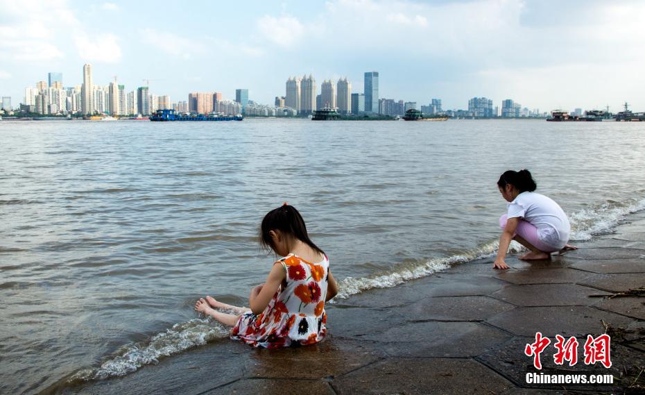 7月14日,在汉口江滩江边,两位小朋友岸边戏水游玩。近日,长江武汉段水位呈快速上涨趋势,江水已漫上亲水平台。中新社记者 张畅摄