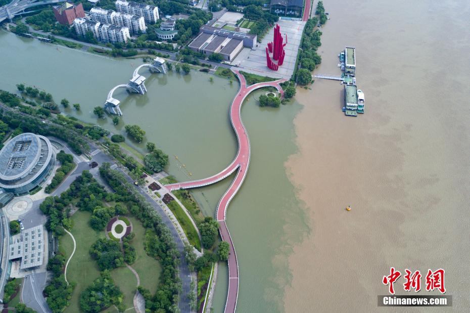 7月10日,航拍长江与南京秦淮河交汇处,江水与河水“泾渭分明”。当日,江苏水利厅发布的水情信息显示,长江南京段水位已降至警戒线以下。中新社记者泱波 摄