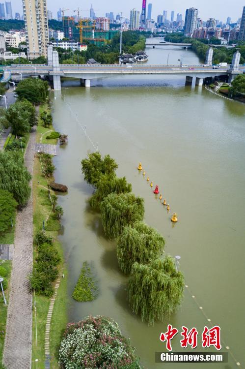 7月10日,航拍长江与南京秦淮河交汇处,树木淹入水中。当日,江苏水利厅发布的水情信息显示,长江南京段水位已降至警戒线以下。中新社记者泱波 摄