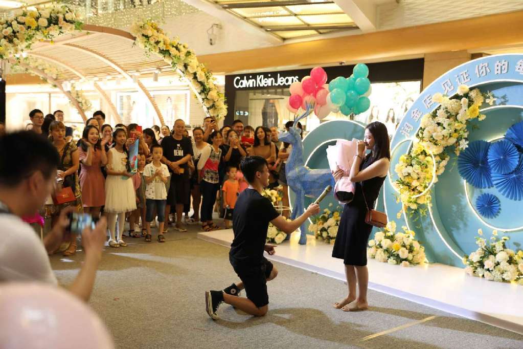 开幕式当天,润金店工作人员还配合市民杨先生上演了一场浪漫的“求婚大作战”。原来,数日前,杨先生到润金店表示要买一枚与众不同的戒指向女友求婚。在销售顾问的建议下,杨先生选购了一枚蓝宝石戒指作为求婚信物。得知杨先生的心意后,润金店品牌策划部决定与杨先一起在七夕当天完成这场浪漫的“求婚大作战”。当天,杨先生带着毫不知情的女友来到润金店“炫出色彩 耀你不凡”VIP品鉴会现场。正当女友全神贯注欣赏小提琴、拉丁舞等开幕式表演节目时,杨先生从兜里掏出事先准备好的蓝宝石戒指,单膝跪地向一脸茫然的女友喊:“嫁给我吧。”此时,开幕式现场背景音乐“配合”地换成了甜蜜的《今天你要嫁给我》。感动得热泪盈眶的女友在围观市民的欢呼中,拉起了杨先生,并答应了他的求婚。围观市民表示“七夕不过是路过,却不料狠狠地吃了一把狗粮。”