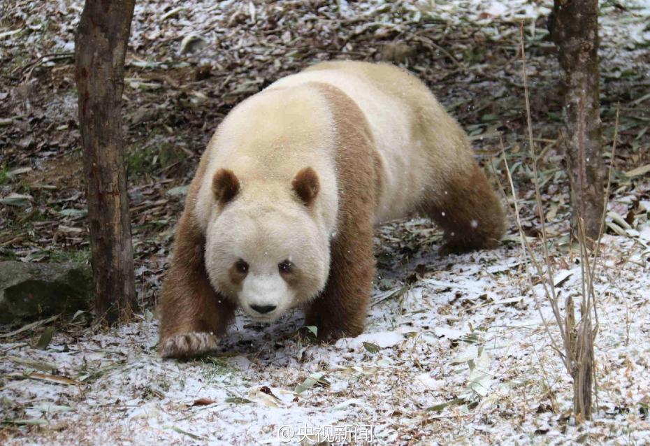 秦岭大熊猫野化培训佛坪基地,7岁的棕色大熊猫七仔是目前全世界唯一能看到的棕色大熊猫活体。今年是它在基地过的第二个冬天,每逢下雪,七仔就兴奋地满园子跑,变身“雪花熊”。央视记者李志王志杰 图片来源:央视新闻官方微博