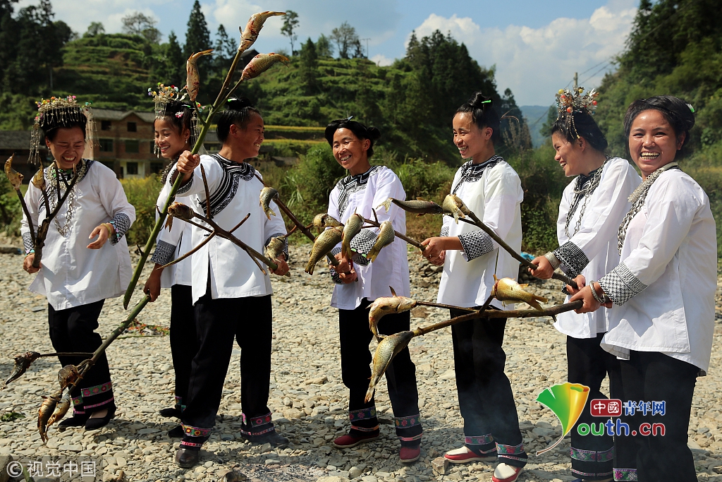 2016年9月17日,贵州省榕江县平阳乡硐里村七位侗家妇女们正烧鱼。每年中秋时节,当地侗族同胞开田放水,捉鱼,全寨男女老少,野外生起篝火烤鱼,用烤鱼、米酒等,祭祀鱼神,祈祷鱼粮丰收的传统民俗活动。