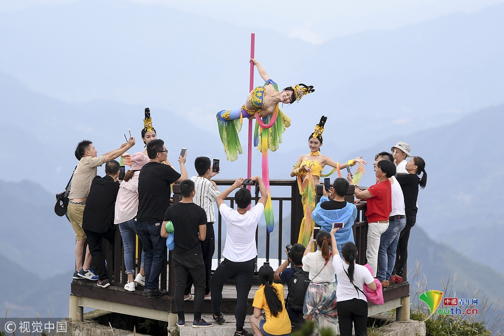 2018年9月20日,中秋节前夕,位于长三角第一高峰海拔1929米的浙江龙泉山顶,一场柔美的钢管舞表演吸引了众人围观。